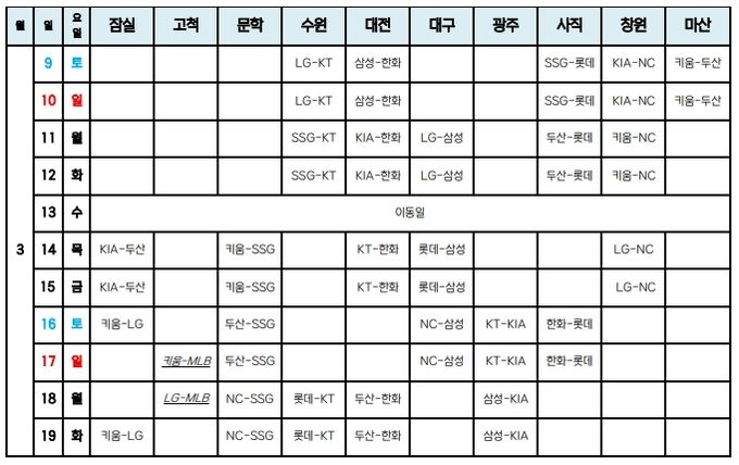 시범경기 개막전은 수원(LG-KT), 대전(삼성-한화), 사직(SSG-롯데), 창원(KIA-NC), 마산(키움-두산) 구장에서 펼쳐진다.