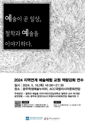 이번 연수는 학생 현장의 예술교육 활성화와 광주교육 문화예술벨트 조성을 위해 마련돼 오는 5월 16일 광주학생예술누리터와 ACC국립아시아문화전당 예술극장1에서 진행된다.