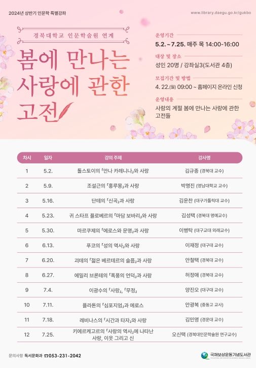 (정도일보) 국채보상운동기념도서관은 경북대학교 인문학술원과 연계하여 시민들의 인문학적 소양을 함양하고 인문학의 대중화에 기여하고자 ‘2024년 상반기 인문학 특별강좌‘봄에 만나는 사랑에 관한 고전’수강생을 모집한다.