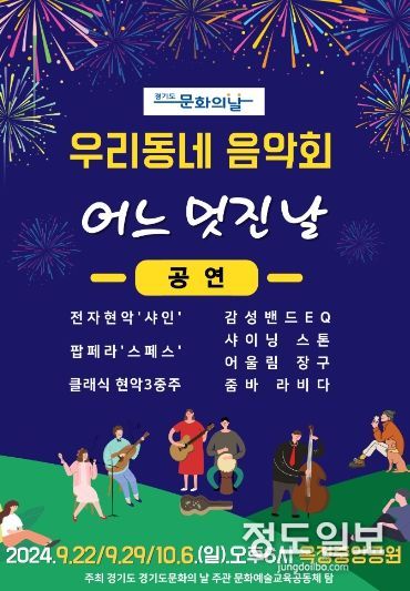 (정도일보) 양주시 문화예술교육공동체 탐은 오는 9월 22일, 29일, 10월 6일 총 3일에 걸쳐 옥정호수공원 야외공연장에서 '2024 경기도 문화의 날' ‘우리동네 음악회 '어느 멋진 날'’을 개최한다고 밝혔다.