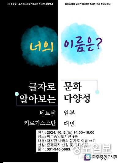 (정도일보) 파주 중앙도서관은 한글날(10.9.)을 맞아 10월 5일, ‘글자로 보는 문화다양성-너의 이름은’ 프로그램을 운영한다.