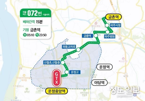 또한, 마을버스 072번은 총 6대의 버스가 금촌역을 기점으로 파주시청, 금릉역, 산내마을을 경유하여 지티엑스(GTX) 운정중앙역까지 운행하는 노선으로, 15분 간격으로 총 66회 운행한다.