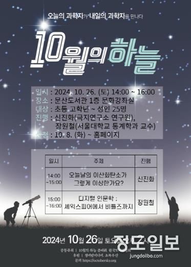 (정도일보) 파주시 문산도서관은 오는 26일 어린이와 성인을 대상으로 과학 강연 ‘10월의 하늘’을 운영한다.