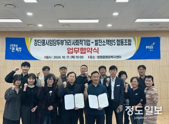 (정도일보) 지난 17일 파주시 법원읍 ‘장단콩사임당두부거리 사회적기업’과 운정5동 ‘발전소책방5 협동조합’은 지역소멸위기 대응과 도농복합도시의 균형발전을 위한 업무협약(MOU)을 체결했다.