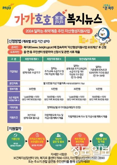권예자 복지지원과장은 “그동안 파주시는 3탄의 가가호호를 통해 수급자 선정 기준 및 혜택, 자활근로사업 등을 소개하며 복지 누수 방지에 집중해 왔다”라며 “앞으로도 유익한 정보 제공으로 복지사각지대 해소에 최선을 다할 것”이라고 밝혔다.