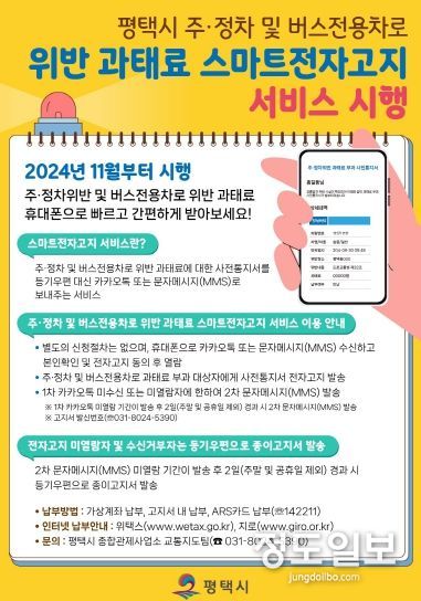 (정도일보) 평택시는 불법 주정차 및 버스전용차로 위반 과태료 사전통지를 전자문서(카카오톡, 문자메시지)로 발송하는 ‘스마트 전자고지 서비스’를 오는 11월 1일부터 시행한다고 밝혔다.
