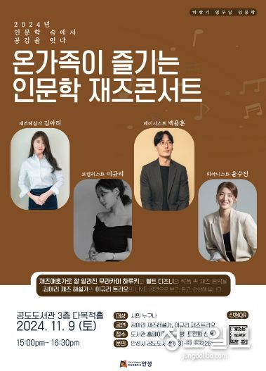 (정도일보) 안성시 공도도서관은 오는 11월 9일 오후 3시, '온가족이 즐기는 인문학 재즈 콘서트' 프로그램을 공도도서관 3층 다목적홀에서 진행한다.