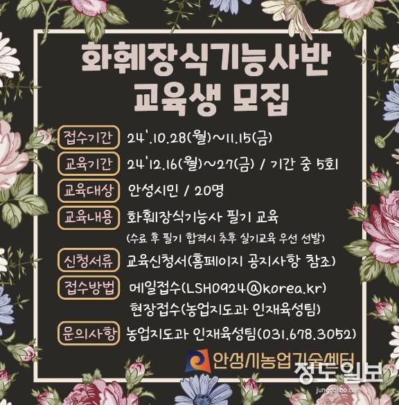 (정도일보) 안성시농업기술센터는 오는 11월 15일까지 화훼장식기능사 필기과정 교육생을 모집한다.