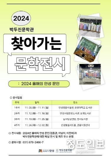 (정도일보) 안성시 박두진문학관은 11월 5일부터 12월 2일까지 4주간 '2024 찾아가는 문학전시 : 올해의 안성 문인'을 운영한다고 밝혔다.
