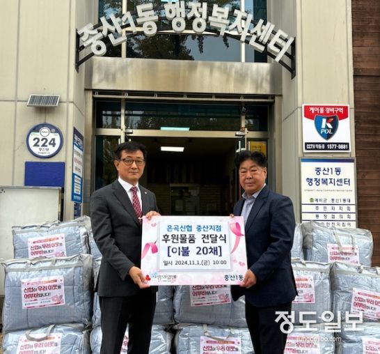 (정도일보) 고양특례시 일산동구 중산1동은 은곡신협 중산지점이 지난 1일, 관내 어려운 이웃을 위해 사용해 달라며 겨울 이불 20채를 중산1동 행정복지센터에 기탁했다고 밝혔다.
