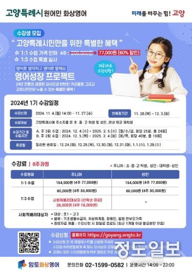 (정도일보) 고양특례시는 ‘고양시 원어민화상영어’를 11월 4일부터 접수를 시작해 오는 12월 4일 개강한다고 밝혔다.