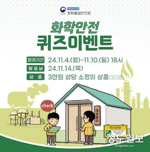 11월 4일부터 10일까지 진행하는 ‘화학사고 대피장소 챌린지’의 참여 방법은 화학물질안전원 인스타그램 혹은 네이버폼에 접속한 후 화학사고 대피장소 관련 퀴즈 정답을 제출하면 된다. 당첨자는 11월 14일에 발표되며, 총 30명에게 3만 원 상당의 상품이 증정된다.