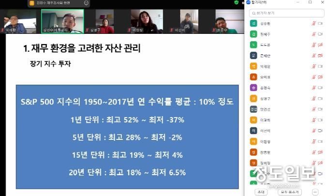 강사는 크게 ▲고령화 저금리 시대의 투자 전략 ▲연금 자산 관리 ▲노후 생활비 이해 등 세 가지 주제를 놓고, 꼭 알아야 할 금융 상식, 지출통제 전략, 연금 자산 운용 방법, 절세 등 재무 설계 방법, 합리적인 노후 생활비 산정 등을 강의했다.
