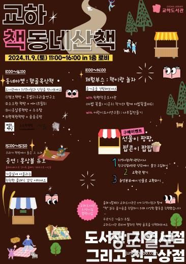 (정도일보) 파주시 교하도서관은 11월 9일 1층에서 지역 서점과 상점이 한자리에 모여 ‘교하 책 동네 산책’을 운영한다.