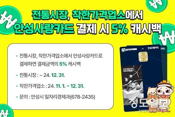 (정도일보) 안성시가 오는 12월 31일까지 관내 ‘전통시장과 착한가격업소’에서 ‘안성사랑카드’를 사용하면 5% 캐시백 혜택을 제공한다고 밝혔다.