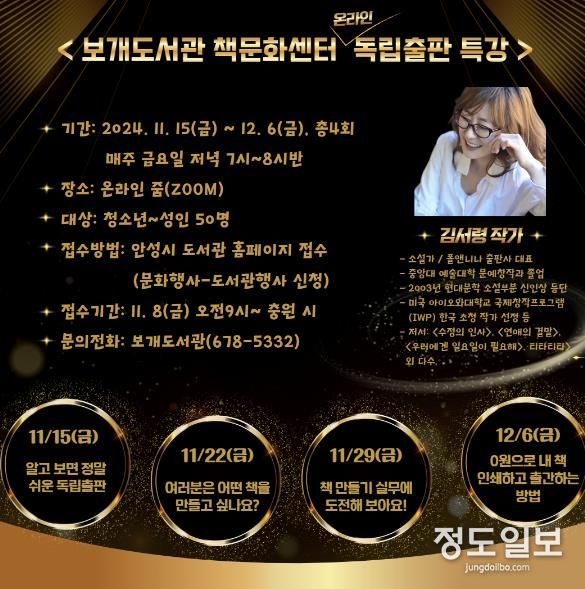 (정도일보) 안성시 보개도서관 책문화센터에서는 11월 15일부터 12월 6일까지 매주 금요일 저녁 7시에 온라인 특강을 진행한다. 최근 소설가 한강 작가의 노벨문학상 소식과 함께 글쓰기 열풍과 독립출판에 대한 관심이 증가하면서 나만의 책을 만들고 싶은 시민들이 늘고 있다.