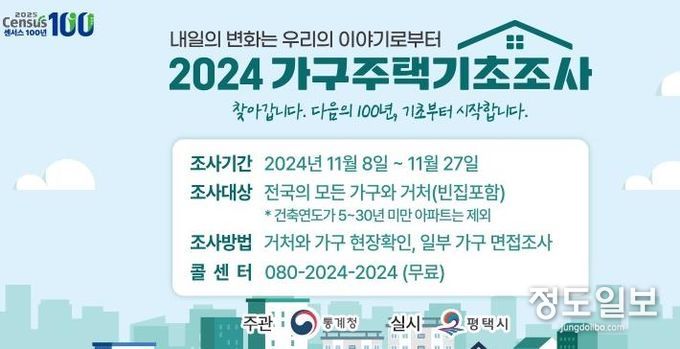 (정도일보) 평택시는 오는 8일부터 27일까지 20일 동안 지역 내 거처 및 가구를 대상으로 통계청이 주관하는 ‘2024 가구주택기초조사’를 실시한다.