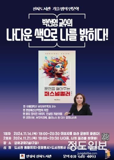 안성시 진사도서관은 오는 11월 14일, 21일 문화강좌실에서 2회에 걸쳐 '운명을 열어주는 퍼스널컬러'의 저자 박선영 교수를 초청해 ‘나다운 색으로 나를 밝히다!’를 주제로 가을 밤의 인문학 강연을 개최한다.