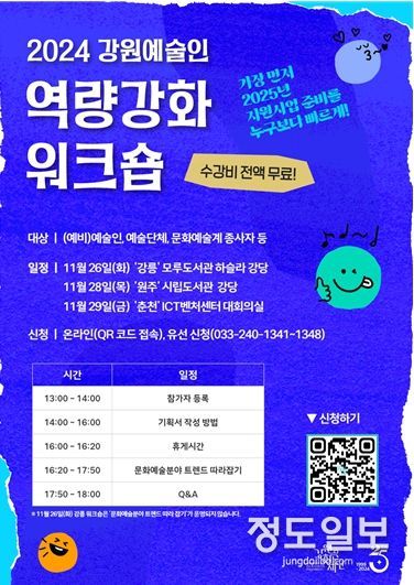 (정도일보) 강원문화재단(대표이사 신현상)은 강원예술인들을 위한 실무 역량 강화를 목적으로 ‘2024년도 강원예술인 역량강화 워크숍’을 개최한다고 밝혔다.