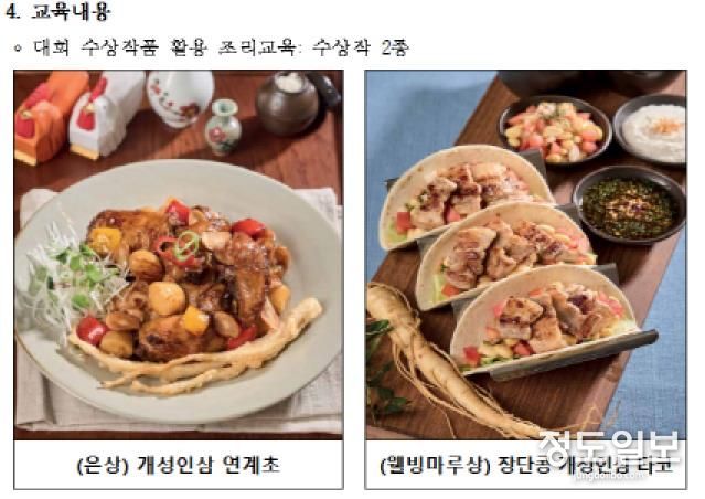 교육 내용은 지난 10월 인삼축제에서 개최된 ‘제15회 파주 장단삼백요리 전국경연대회’ 수상작 2종 ‘개성인삼 연계초’와 ‘장단콩 개성인삼 타코’의 조리법 교육 및 조리시연, 참가자들의 조리실습으로 구성된다.