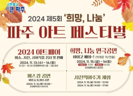 (정도일보) 파주시가 주최하고 (사)한국예총 파주지회에서 주관하는 '2024 제5회 ‘희망, 나눔’ 파주 아트페스티벌'이 오는 13일부터 16일까지 운정행복센터에서 개최된다.