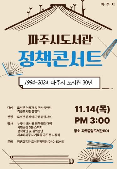 (정도일보) 파주시는 오는 14일 오후3시 파주중앙도서관에서 도서관 30주년 기념 ‘도서관 정책콘서트’를 개최한다.