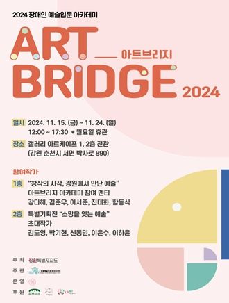 이번 전시의 제목은 ‘2024 아트 브리지(Art Bridge)’로, ‘창작의 시작, 강원에서 만난 예술’과 ‘소망을 잇는 예술 특별전’으로 구성된다. 아카데미에 참여한 5명의 장애인 작가와 함께 수도권 장애예술인 5명이 참여하여 다채로운 예술 작품을 선보일 예정이다.