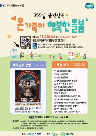 이명희 보육아동과장은 “아이가 행복한 도시, 아이 키우기 좋은 도시를 위해 여러 단체가 협력한 이번 행사에 많은 관심과 참여를 바라며, 앞으로도 부모의 양육 부담을 덜고 돌봄 공백 없는 파주시를 위해 최선을 다하겠다”라고 말했다.