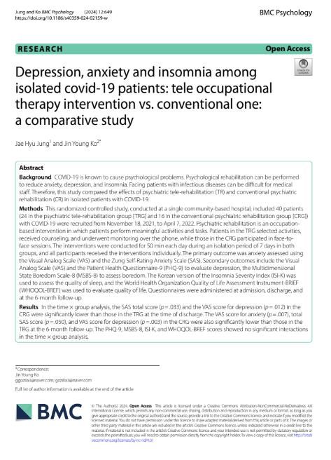 (정도일보) 경기도의료원 안성병원 연구진은 코로나19로 입원 치료한 환자에 대한 비대면, 대면 작업치료 중재군의 비교 연구 결과(Depression, anxiety and insomnia among isolated covid-19 patients: tele occupational therapy intervention vs. conventional one: a comparative study) 비대면 및 대면 작업치료 중재군 모두 정신건강 개선에 효과적이었고, 대면 작업치료 중재의 경우 퇴원 후 6개월이 지난 시점에서도 효과가 유지되었음을 밝혔다.