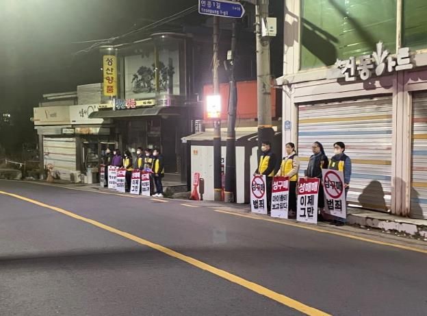 이날 캠페인은 성구매자들이 가장 많이 찾는 금요일 밤 10시부터 다음날 새벽 3시까지 성매매집결지 출입구에서 ‘성매매 이제그만’, ‘성구매 범죄’ 등의 팻말을 들고 성매매가 불법임을 알리는 동시에 성구매자들의 출입을 차단하는 방식으로 진행됐다.
