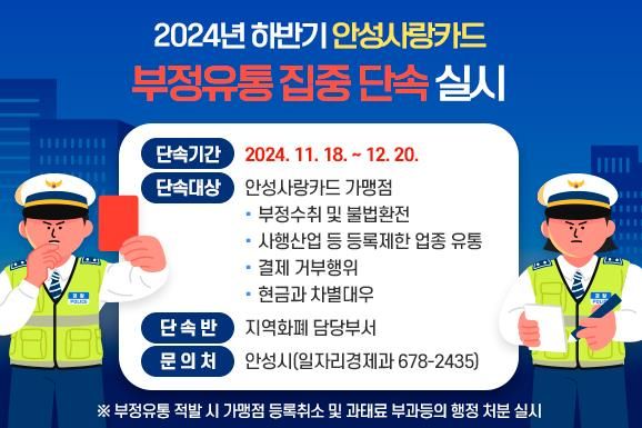 시 관계자는 “안성사랑카드가 지역경제 활성화를 위한 제도인 만큼 부정유통을 근절하기 위해 철저히 단속하겠다“며 ”주변에서 부정유통 행위가 의심 될 경우 안성시청 일자리경제과로 신고해 주시기를 바란다”고 말했다.