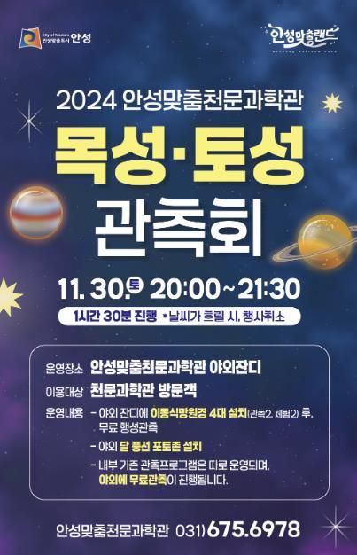 (정도일보) 안성시 안성맞춤랜드에 위치한 안성맞춤천문과학관에서는 오는 11월 30일에 천문과학관 야외 관측장소에서 목성과 토성이 함께 관측 가능한 ‘목성·토성 관측회’를 운영한다고 밝혔다.