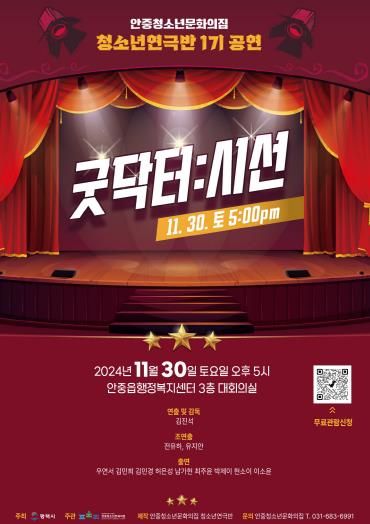 (정도일보) 평택시 안중청소년문화의집은 오는 30일 오후 5시에 안중읍 행정복지센터 대회의실에서 청소년연극반의 기획공연 '굿닥터:시선'을 청소년과 지역주민 100여 명을 대상으로 선보일 예정이라고 밝혔다.