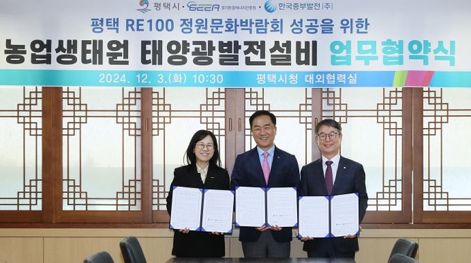 (정도일보) 평택시는 지난 3일 평택시청 대외협력실에서 경기환경에너지진흥원 및 한국중부발전과 함께 평택 RE100 정원문화박람회 성공을 위한 농업생태원 태양광발전설비 업무협약을 체결했다.