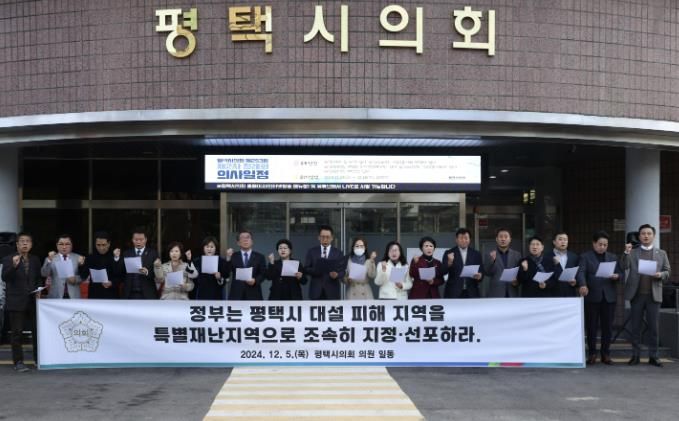 [정도일보 김제영 기자] 평택시의회는 5일, 평택시의회 앞에서 최근 폭설로 인한 대규모 피해에 대해 ‘평택시 대설 피해 특별재난지역 선포 촉구 성명서’를 발표했다.