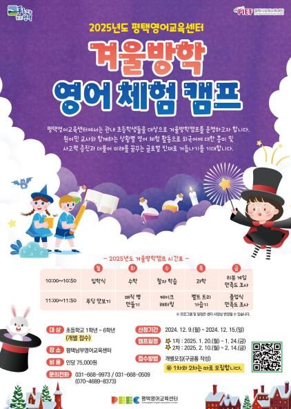 (정도일보) 평택시국제교류재단 평택영어교육센터는 겨울방학을 맞아 원어민 교사와 함께하는 주제별 영어학습 및 체험 활동으로 구성된 방학 캠프 프로그램(1기)을 오는 1월 20일부터 5일간 운영한다.