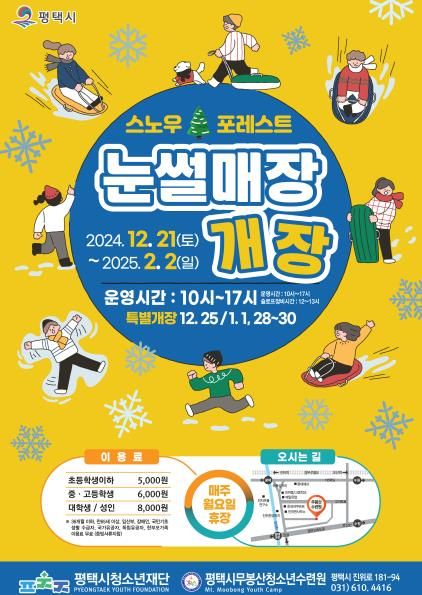 (정도일보) (재)평택시청소년재단 평택시무봉산청소년수련원은 오는 21일부터 내년 2월 2일까지 야외 눈썰매장을 운영한다고 밝혔다.