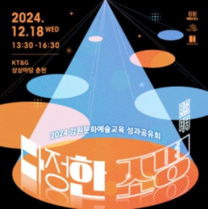 (정도일보) 강원문화재단은 12월 18일, 케이티앤지(KT&G) 상상마당 춘천 사운드홀에서 ‘2024 강원문화예술교육 통합 성과공유회’를 개최한다고 밝혔다.