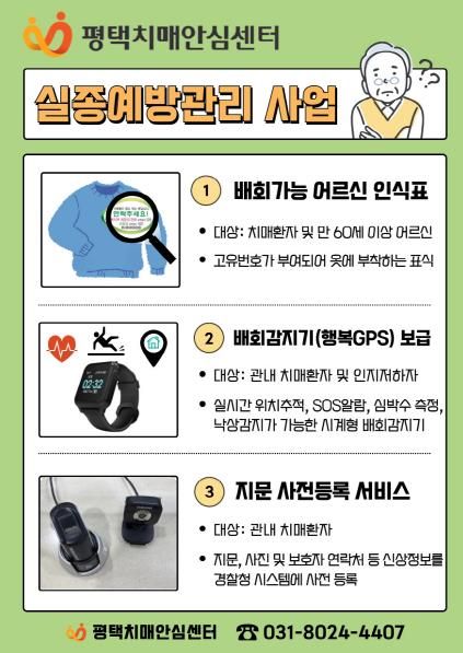평택보건소 관계자는 “치매 환자와 가족이 안심하고 생활할 수 있도록 실종 예방·관리 홍보에 힘쓰겠다”며 “유튜브 평택·송탄보건소(몸마음 튼튼)을 통해 실종 예방 서비스에 관한 자세한 정보를 확인할 수 있다”고 전했다.