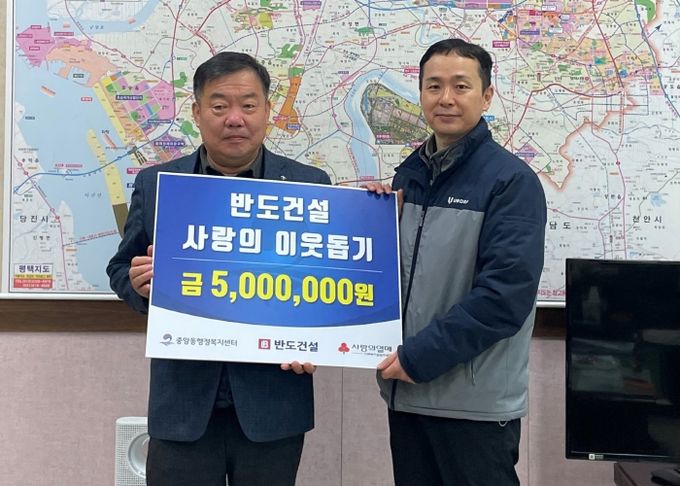 (정도일보) ㈜반도건설에서 연말을 맞아 어려움을 겪고 있는 관내 이웃에게 전달해 달라며 23일 평택시 중앙동 행정복지센터로 성금 500만 원을 기부하며 따뜻한 나눔의 손길을 전했다.