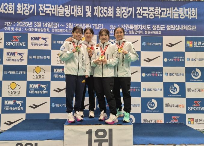 [정도일보 정근영 기자] 경기주택도시공사(GH) 여자레슬링팀이 올해 국내 첫 대회인 ‘제43회 회장기 전국레슬링대회’에서 출전선수 전원이 개인전 금메달을 딴 데 이어 단체전 우승까지 거머쥐면서 ‘금빛 돌풍’을 일으켰다.
