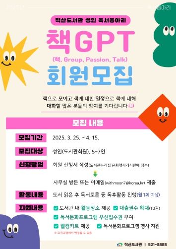 (정도일보) 천안시 직산도서관은 오는 3월 25일~ 4월 15일 성인 독서동아리 ‘책GPT’ 회원을 모집한다고 20일 밝혔다.