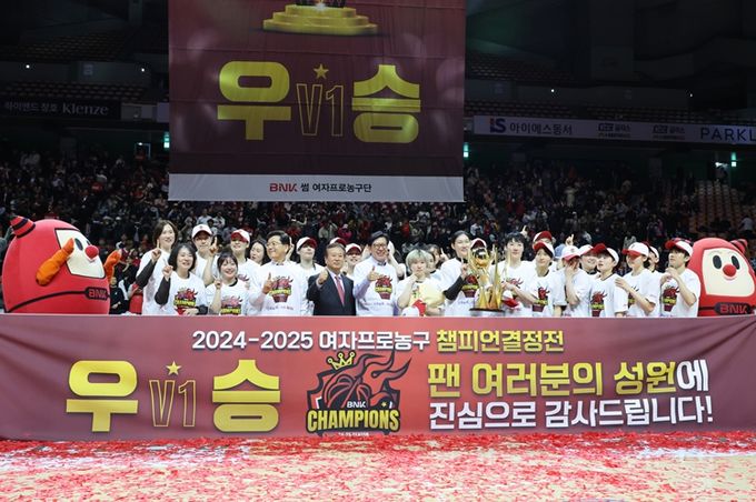 부산 비엔케이(BNK) 썸(SUM) 농구단은 아산 우리은행 우리 원(WON)을 3:0으로 꺾고 '2024-2025 여자 프로농구 챔피언 결정전'에서 승리하며, 2019년 창단이래 '첫 우승'이라는 금자탑을 세웠다.