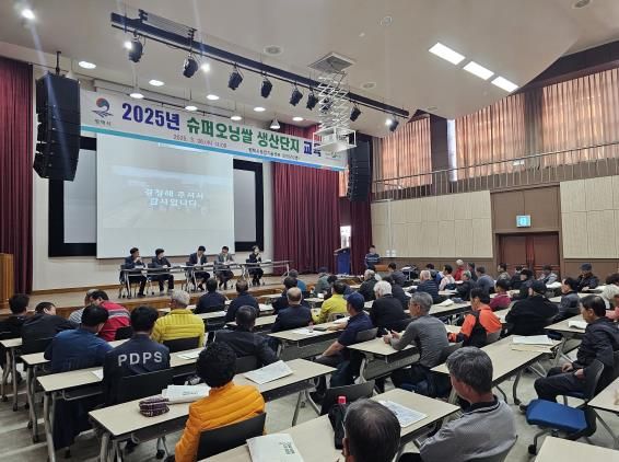 (정도일보) 평택시농업기술센터는 지난 26일 농업기술센터 대강당에서 슈퍼오닝쌀 생산단지 참여 농업인 250여 명이 참석한 가운데 봄철 종자 파종부터 기후변화 대응, 고품질쌀 생산을 위한 재배 기술 등 품질 좋은 슈퍼오닝 명품쌀 생산을 위한 농업인 사전교육을 진행했다.