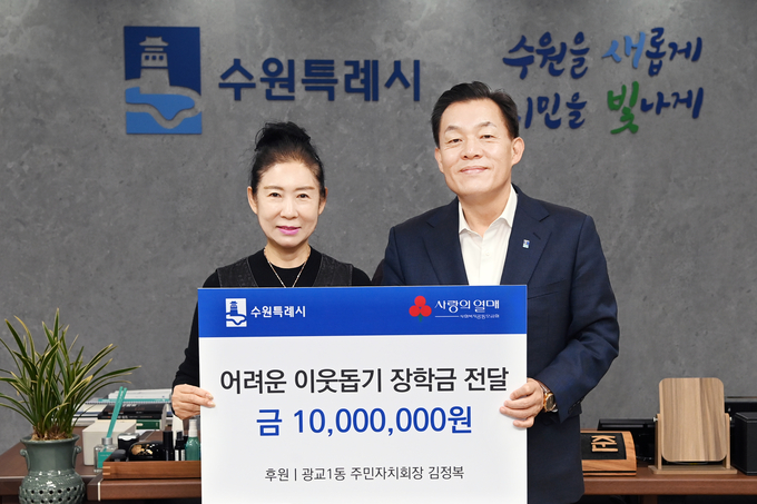 [정도일보 고정희 기자] 수원 영통구 광교1동 주민자치회 김정복 회장이 “경제적으로 어려움을 겪는 가정의 학생을 후원하는 데 사용해 달라”며 수원시에 장학금 1000만 원을 기부했다.