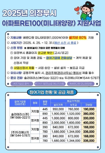 참여를 원하는 시민은 의정부시 누리집 고시공고란의 ‘2025년 의정부시 아파트RE100(미니태양광) 지원사업 신청자 모집’ 공고문을 참고해, 참여기업과 직접 상담 후 계약을 체결하면 된다. 상세한 문의는 시 기후에너지과 에너지관리팀으로 하면 된다.