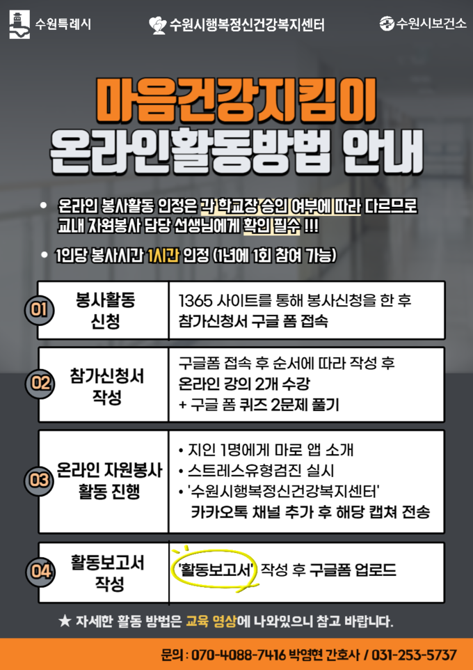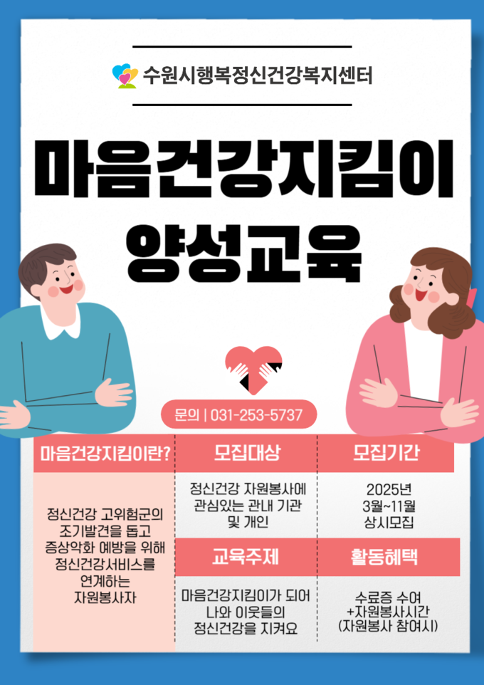 온라인·대면 교육으로 마음건강지킴이를 양성한다. 온라인 교육은 수원시행복정신건강복지센터 유튜브(https://www.youtube.com/@SUWONMHC)에서 수강할 수 있다. 교육 수강 후 1365 자원봉사와 연계해 봉사 시간을 인정받을 수 있다.
