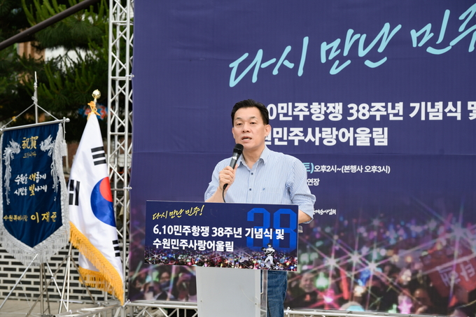 [정도일보 고정희 기자] 이재준 수원시장이 7일 남문로데오 청소년문화공연장에서 열린 ‘제38주년 6·10민주항쟁 기념식’에서 “38년 전 6.10 민주항쟁 역사가 있었기에 민주주의가 이어지고 있다”고 말했다.