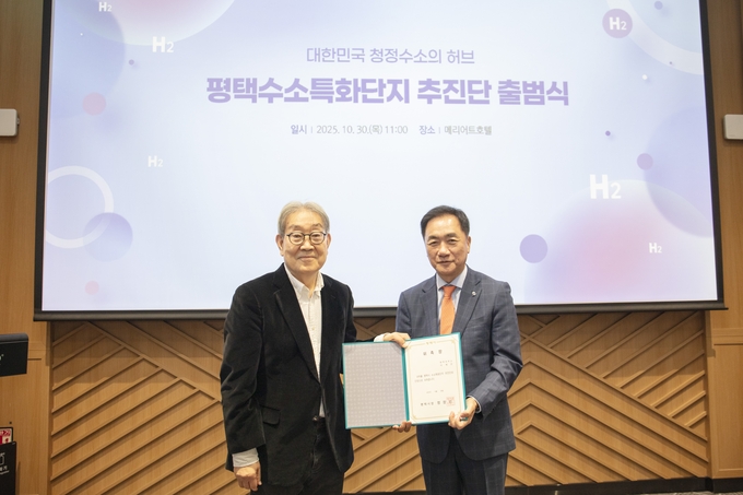 ![국제 수소 도시로 불리는 평택시가 본격적인 수소경제 활성화를 위해 수소특화단지 추진단을 출범시켰다. 공동 추진단장으로 임명된 이계안 평택대학교 이사장(왼쪽)과 정장선 평택시장이 기념촬영을 하고 있다 [사진=평택시]](http://www.jungdoilbo.com/data/photos/20251044/art_17618567788779_39220e.jpg?iqs=0.7275876091943758)