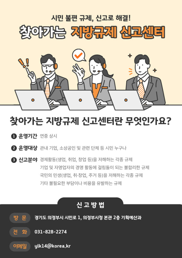 [정도일보 김현섭 기자] 의정부시는 시민의 일상과 기업 활동을 저해하는 불합리한 규제를 현장에서 직접 듣고 해결하기 위해‘찾아가는 지방규제 신고센터’를 연중 상시 운영한다고 12일 밝혔다.